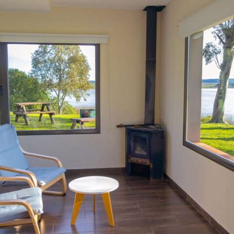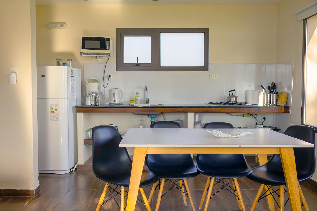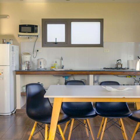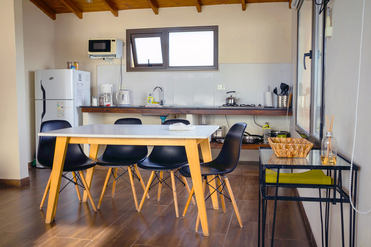Amplios espacios totalmente equipados, baños privados con bañera y bidet, Habitación con cama doble, Comedor con dos camas individuales. Anafe (no tiene horno), Microondas, Pava y Cafetera eléctrica, Tostadora y Licuadora, Heladera c/Freezer, Vajilla, TV Led, Aire Acondicionado Frío-Calor, Estufa a Leña, Cortinas de Blackout y Parrilla Individual. Incluye desayuno, DirecTV, Wi-Fi y Pileta.