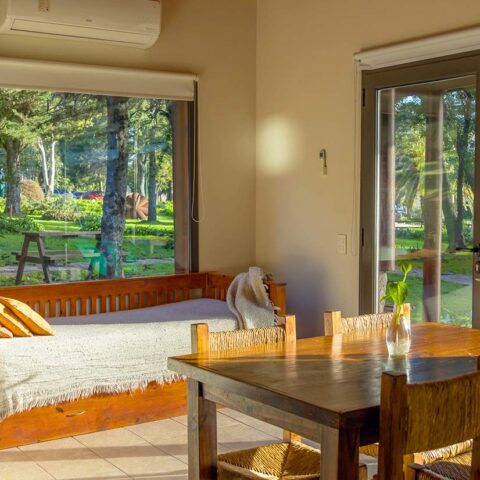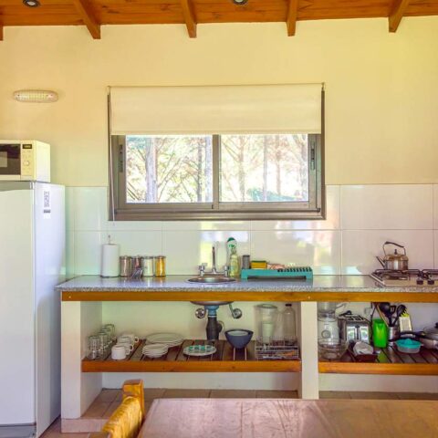 1 habitación con Cama Doble (Ropa Blanca), Baño Privado (Secador de Cabello) con bañera y bidet, Comedor y dos camas Marineras. Anafe (no tienen horno), Microondas, Heladera, Pava y Cafetera eléctrica, Tostadora y Licuadora, TV Led, Vajilla, Cortinas de Blackout, Estufa a Leña, Parrilla Individual. Incluye Desayuno, Aire Acondicionado Frio-Calor, DirecTV, Wi-fi y Pileta. Caja de Seguridad sin costo adicional
