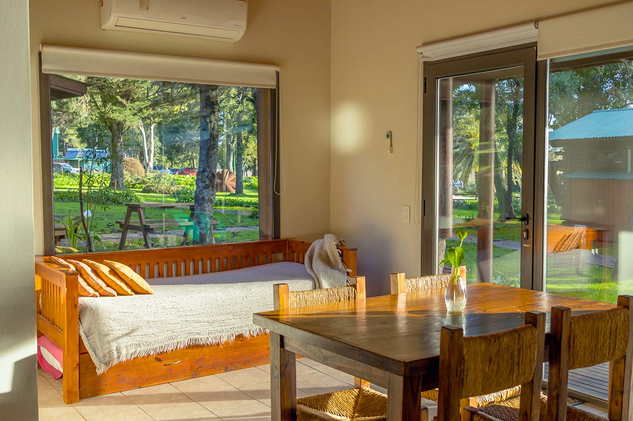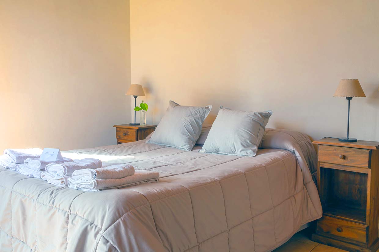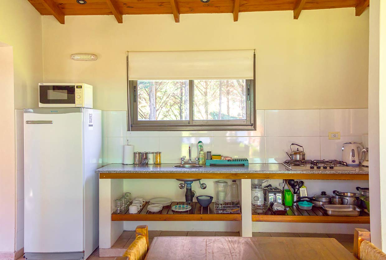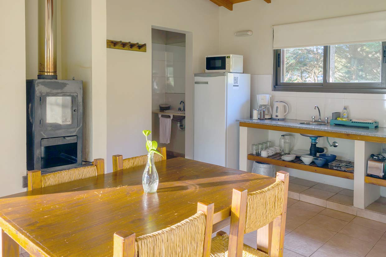 1 habitación con Cama Doble (Ropa Blanca), Baño Privado (Secador de Cabello) con bañera y bidet, Comedor y dos camas Marineras. Anafe (no tienen horno), Microondas, Heladera, Pava y Cafetera eléctrica, Tostadora y Licuadora, TV Led, Vajilla, Cortinas de Blackout, Estufa a Leña, Parrilla Individual. Incluye Desayuno, Aire Acondicionado Frio-Calor, DirecTV, Wi-fi y Pileta. Caja de Seguridad sin costo adicional
