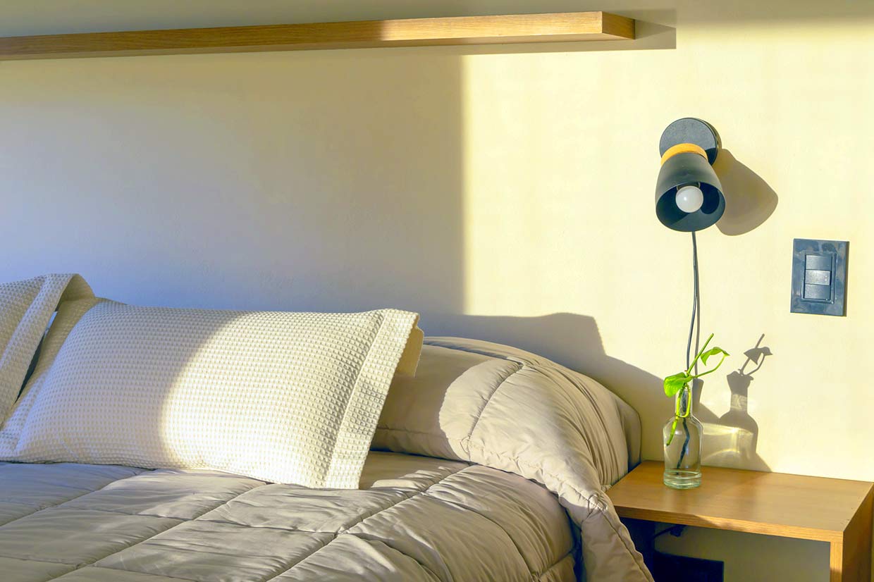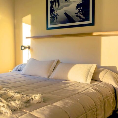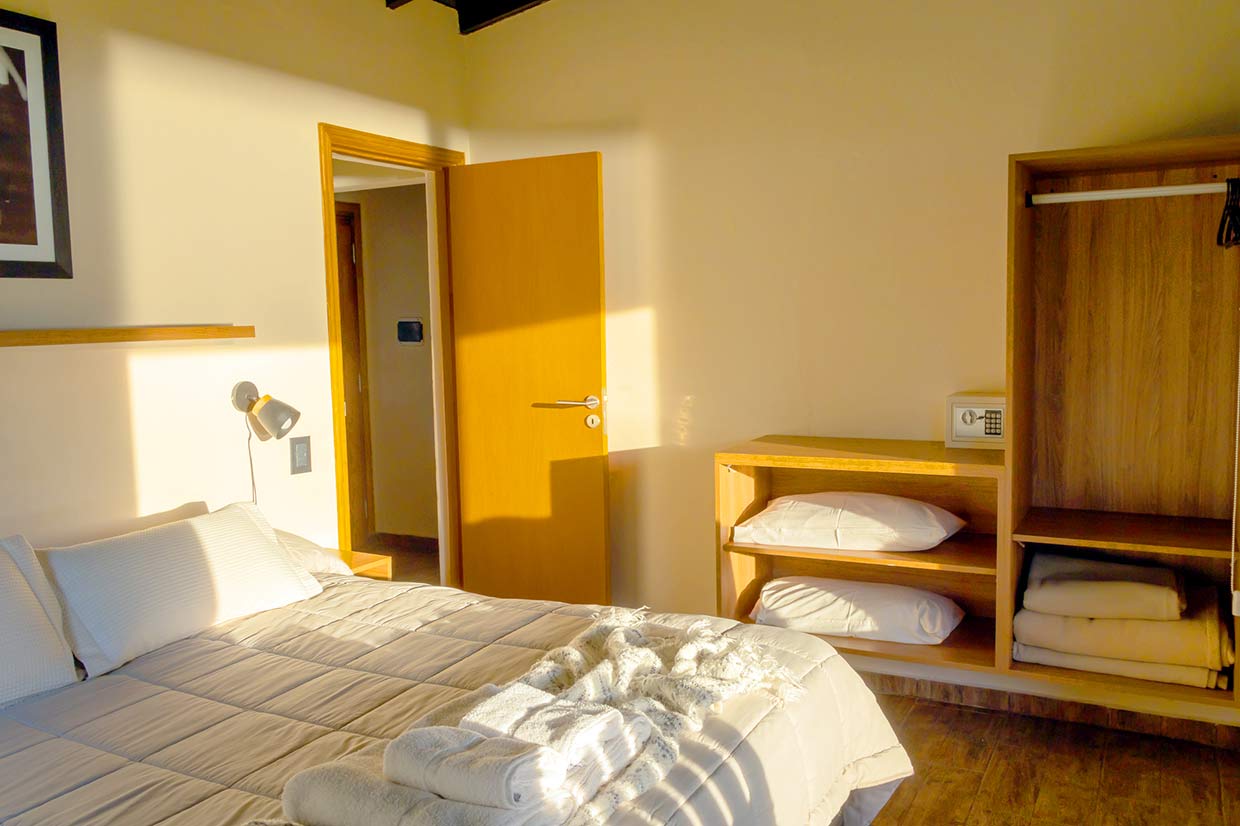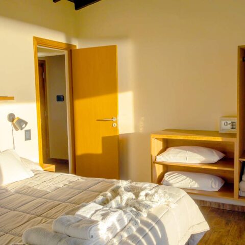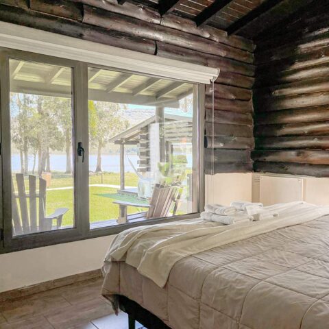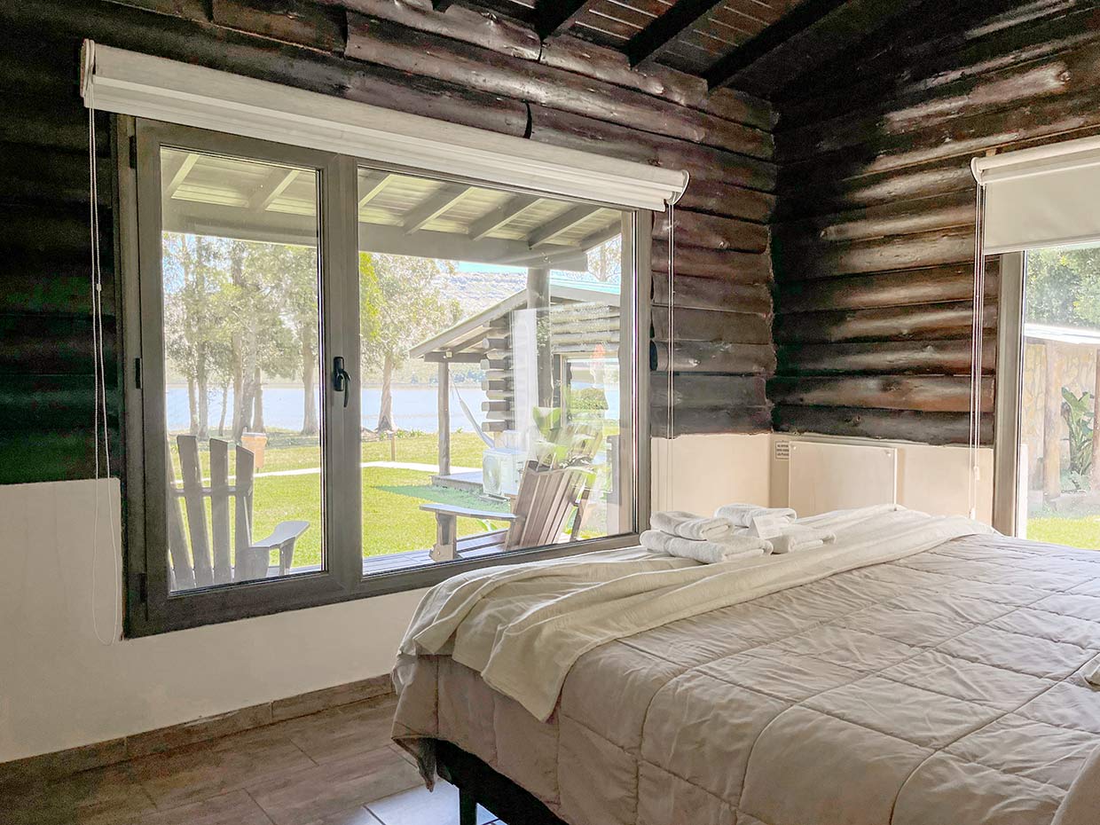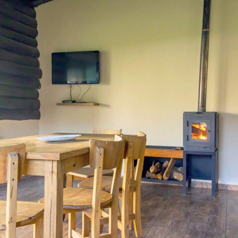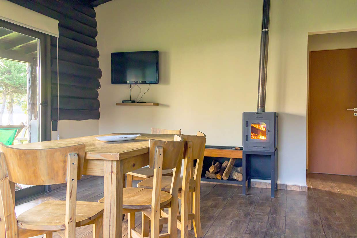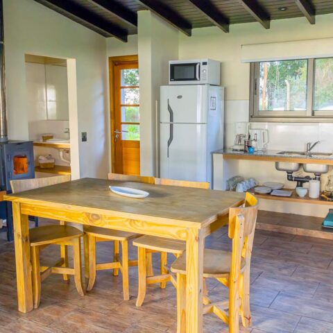 1 habitación con Cama king size (Ropa Blanca), Baño Privado (Secador de Cabello) con bañera y bidet, Comedor y dos camas Marineras. Anafe (no tienen horno), Microondas, Heladera, Pava y Cafetera eléctrica, Tostadora y Licuadora, TV Led, Vajilla, Cortinas de Blackout, Estufa a Leña, Parrilla Individual. Incluye Desayuno, Aire Acondicionado Frio-Calor, DirecTV, Wi-fi y Pileta. Caja de Seguridad sin costo adicional