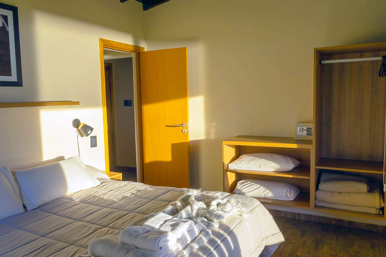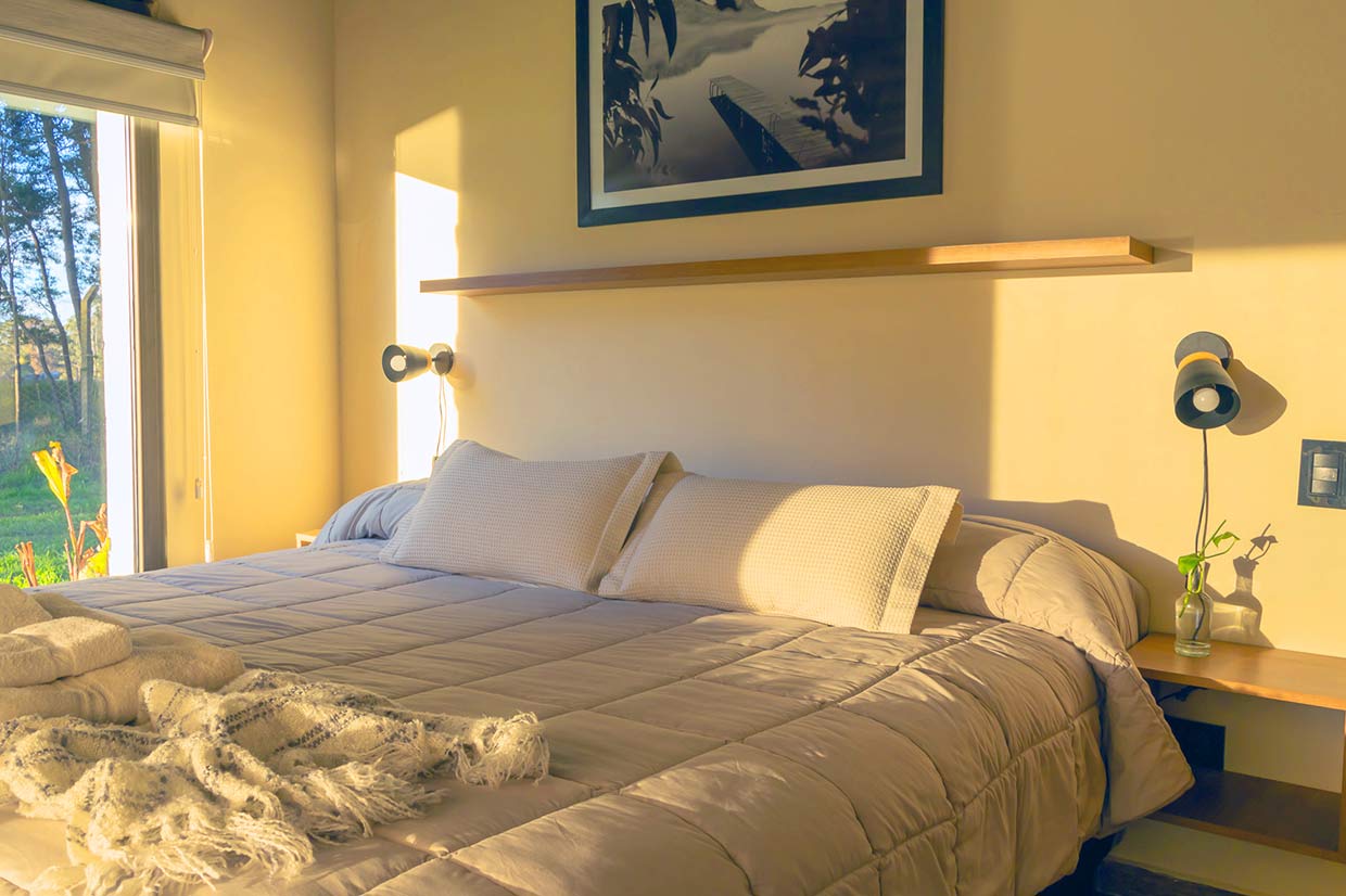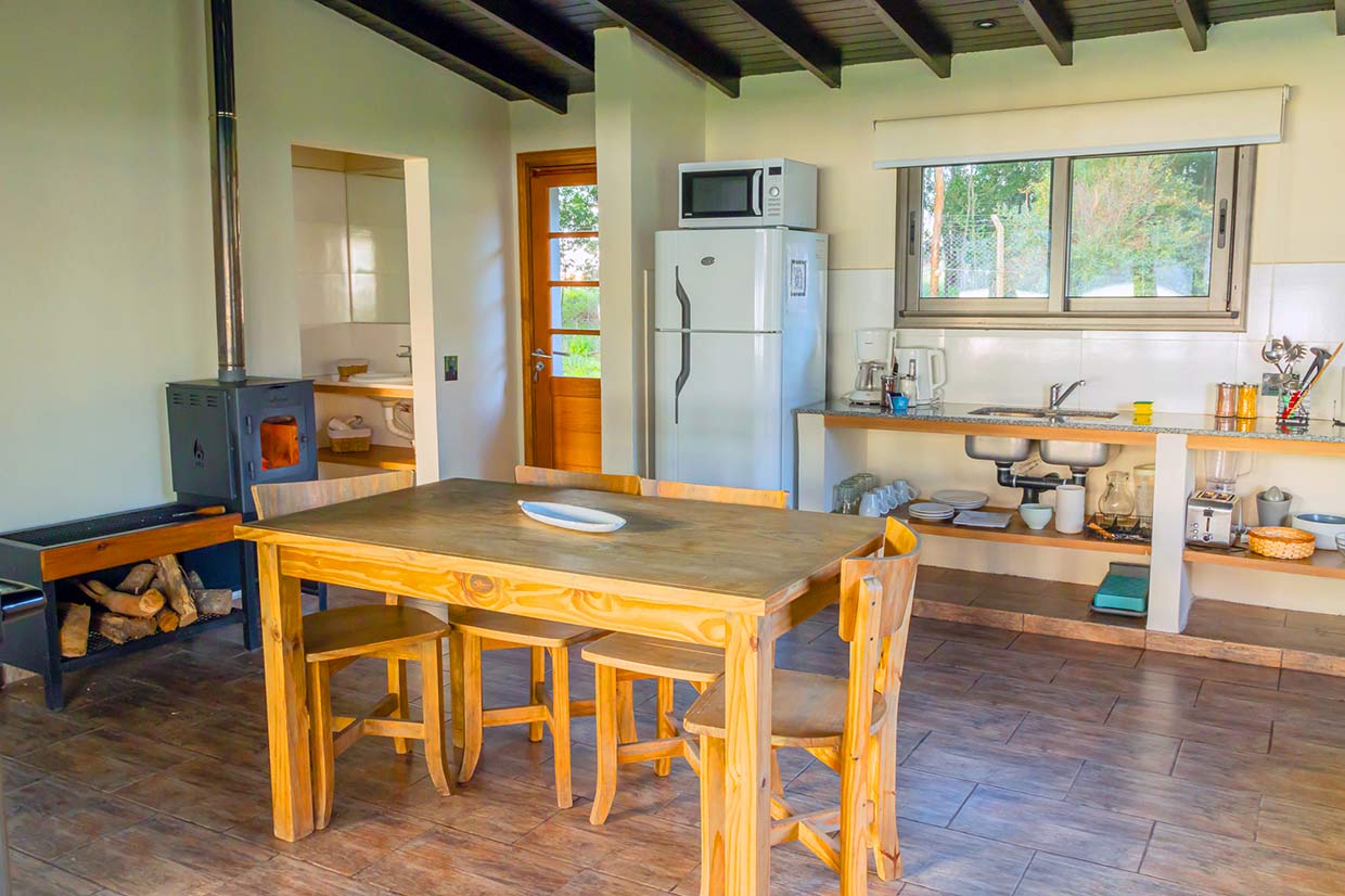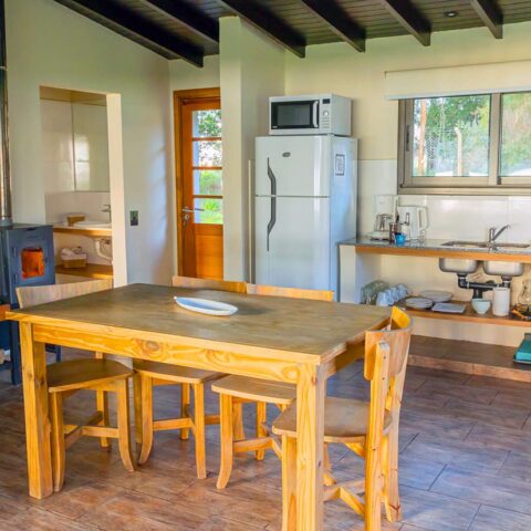1 habitación con Cama king size (Ropa Blanca), Baño Privado (Secador de Cabello) con bañera y bidet, Comedor y dos camas Marineras. Anafe (no tienen horno), Microondas, Heladera, Pava y Cafetera eléctrica, Tostadora y Licuadora, TV Led, Vajilla, Cortinas de Blackout, Estufa a Leña, Parrilla Individual. Incluye Desayuno, Aire Acondicionado Frio-Calor, DirecTV, Wi-fi y Pileta. Caja de Seguridad sin costo adicional